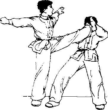 动作要求:弹踢时腿由屈到伸,力达脚尖,冲拳和弹踢要 连贯快速进行。