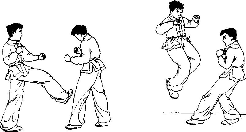 图 5-104图 5-104图 5-105图 5-105接实战预备式,我以右腿向前蹬击对方膝关节,以吸引对 方注意力;接着左腿蹬地跳起,在空中身体稍右转,左腿展髓,