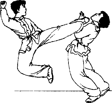 接实战预备式,我用左冲拳(直拳)进攻对方面部,对方 以右臂向外格防,我立即用左腿弹踢对方裆部或腹部(图5-97、 5-98)o