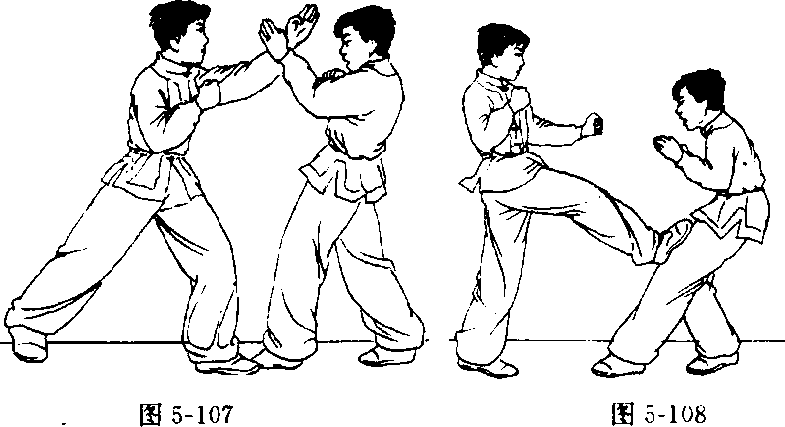 蹬截对方左膝关节处(图5-107. 5-108)。