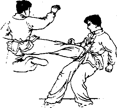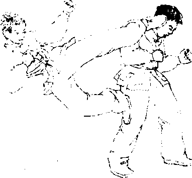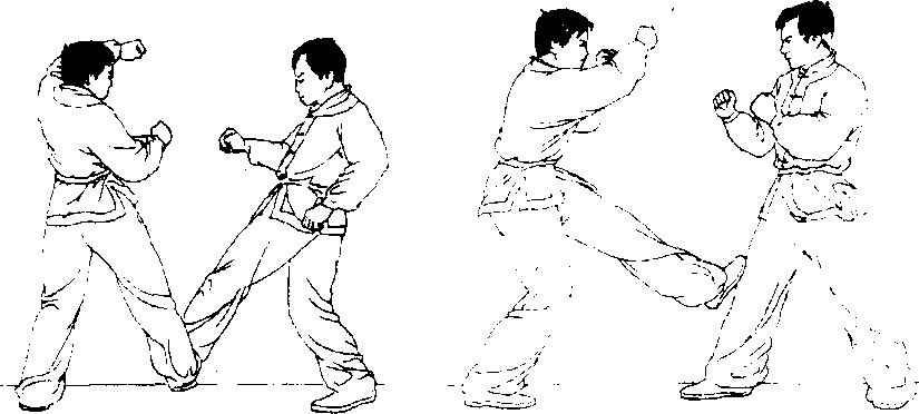 动作要求:勾踢要和转体动作相配合,动作要脆快有力;当 对方向后撒步时,应立即用左脚蹬击对方右膝。