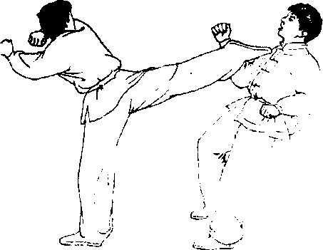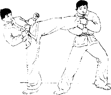 接实战预备式,我突 嚣蹬地腾空跳起,两腿先 屈膝上提,然后上体右倾, 以左腿瑞击对方面部,右 腿端击对方膝部(图