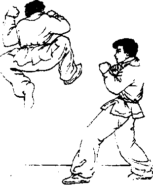 动作要求:起跳要突然,两腿同时分击对方头部和膝部,落 地时要注意自我保护,即右手右腿先落地成侧卧式。
