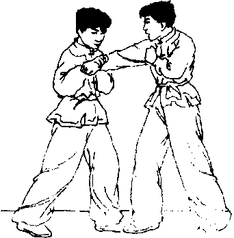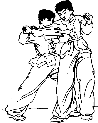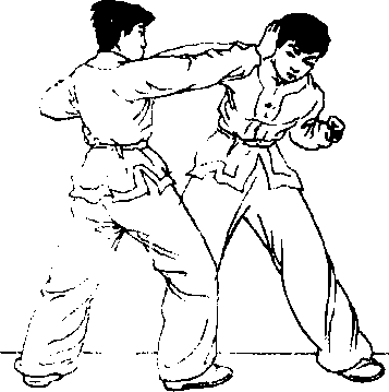 时准确,并用力拉带;上步要 快速,顶肘要凶狠。10、格挡横摆肘接实战预备式,对方以左 直拳攻击我面部,我左臂弯屈. 格挡对方来拳;再迅即上右步 至对方左脚后侧,同时以右肘 横摆击打对方颈部或头部(图 5-153. 5-154)。时准确,并用力拉带;上步要 快速,顶肘要凶狠。10、格挡横摆肘接实战预备式,对方以左 直拳攻击我面部,我左臂弯屈. 格挡对方来拳;再迅即上右步 至对方左脚后侧,同时以右肘 横摆击打对方颈部或头部(图 5-153. 5-154)。图 5-152图 5-152