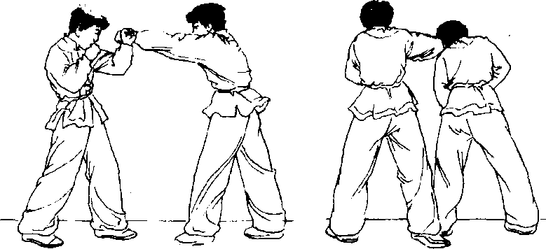 接实战预备式,对方以右 直拳击打我面部,我向右闪身 避过其锋,并以右手刁搂住对 方右手腕向右后侧拉带;同时, 左脚进步落在对方右脚后侧, 以左肘顶击对方右肋处(图5- 151、 5-152)0