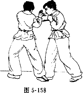 接实战预备式,对方以右直拳进攻我面部或胸部,我上右 步身体左转90度侧闪,并以右臂拦防,左手顺势抓住对方右手 腕向左下方拉带,同时右掌推击对方面部(图5-158、5-159)。