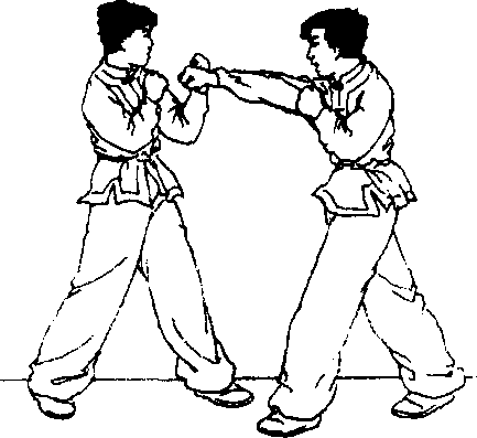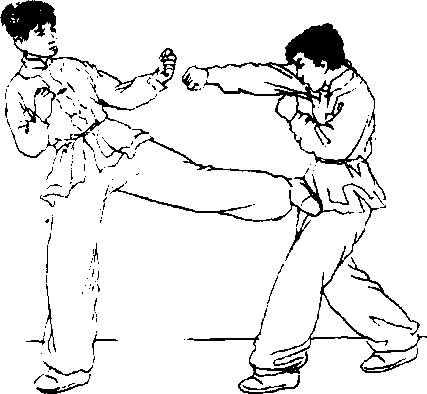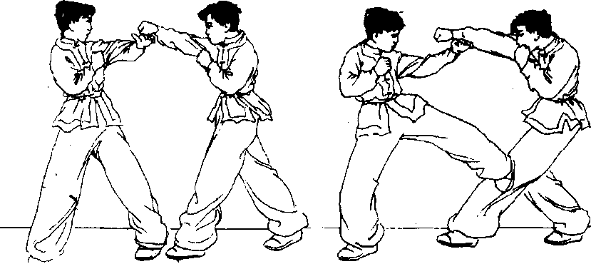 图 5 162图 5 162接实战预备式,对方以右 直拳攻击我面部,我即用左臂 格防?并迅即以右腿支撑身体 重量’上体右倾,用左腿侧踹 对方胸腹部(图5-162、5-