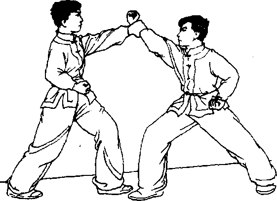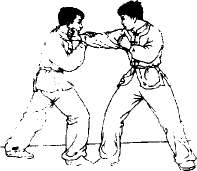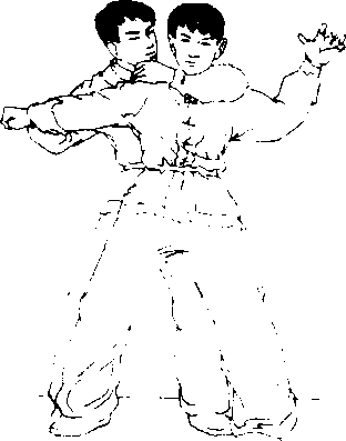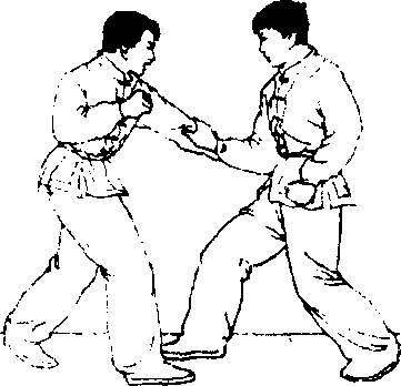 双方实战预备式站立,对方上右步以右拳击打我胸腹部,我 向后闪防,并顺势以左手抓搂住对方右手腕向左后方拉带;随 即右腿经对方右腿外侧上步,落在对方身后,别住对方右腿。同 286