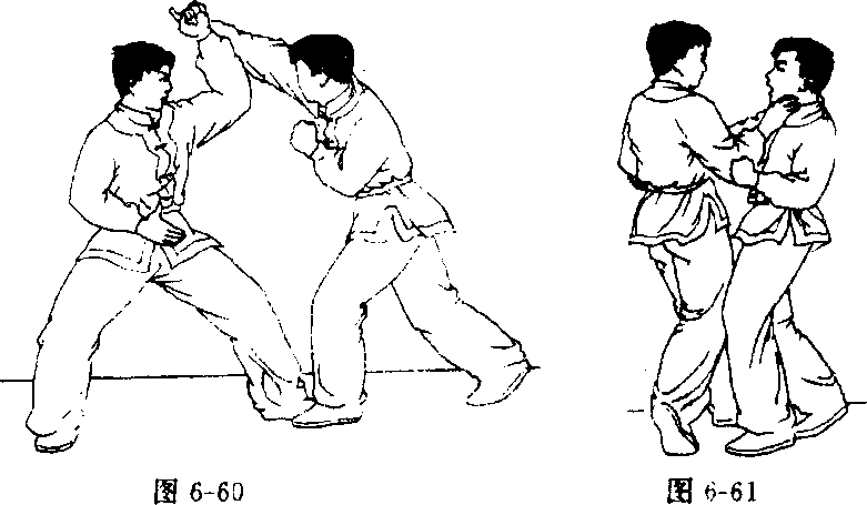 双方实战预备式站立,对方以右掌自上而下劈击我头部.我 以左前臂上架防守,并顺势抓住对方右手腕.随上体左转之势. 向左后方拉带;同时,身体重心前移,靠近对方,右手虎口张 口.向前卡住对方喉头?使其喉颈受制(图6-60、6-61)。