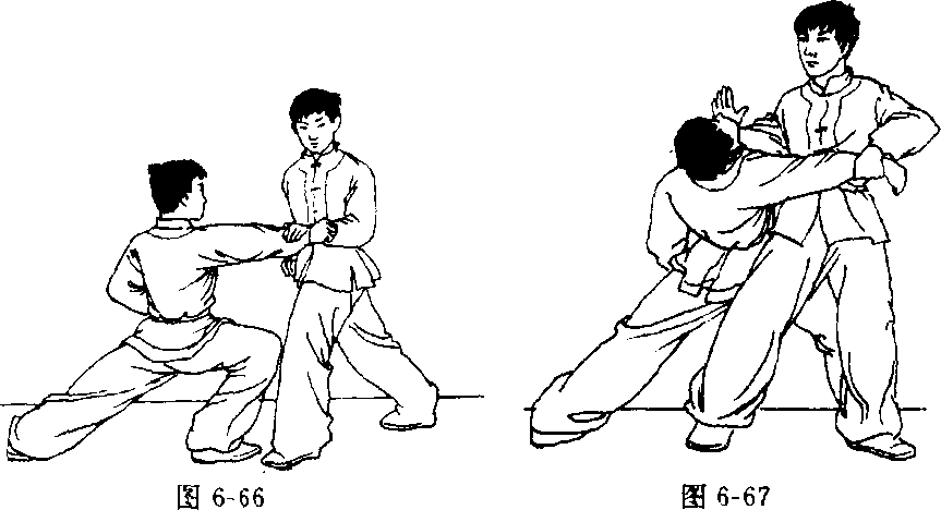 时以右手的掌根部向前猛推对方的下颌,使对方受制(图6-66、 6-67)。