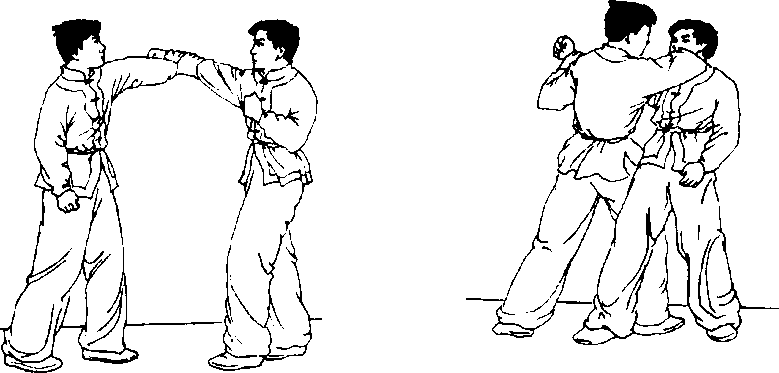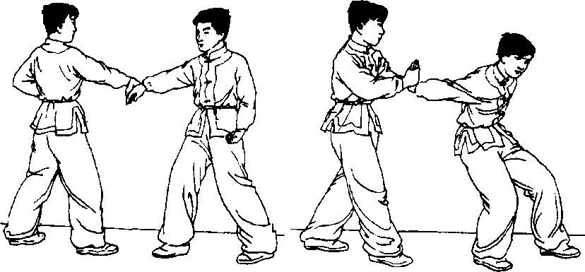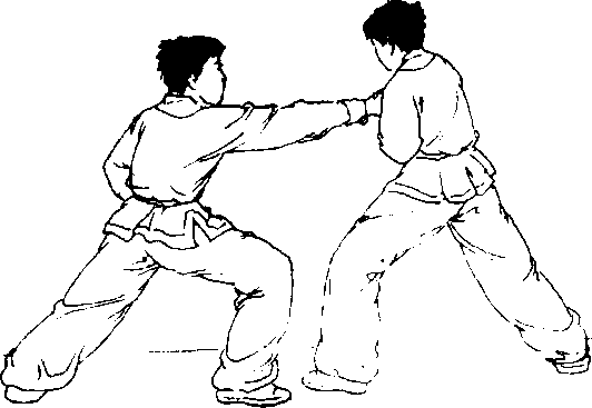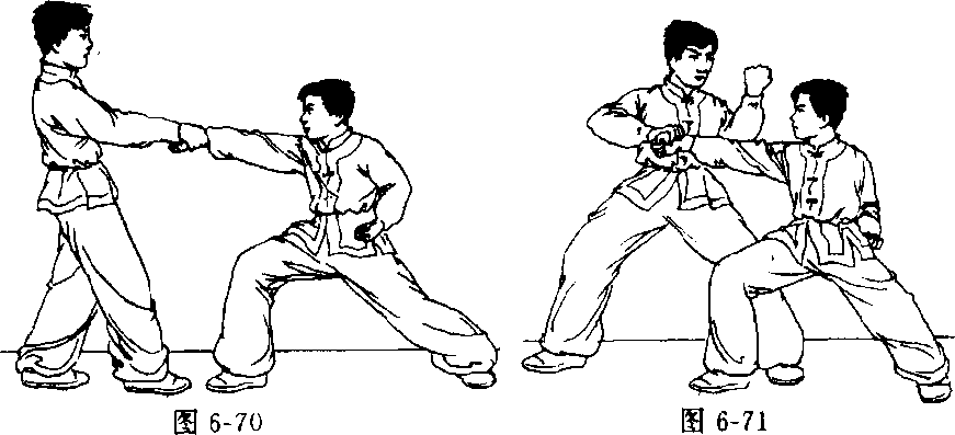 图 6-69.图 6-69.双方实战预备式站立,对方 上右步以右拳攻打我胸腹部,我 撤左步后闪防守,并顺势以右手 抓住对方右手腕;随即左脚向前上步,落在对方右腿后侧,身 体右转90度,两腿屈膝成马步,随转体之势右手向右侧猛拉。 同时,左臂弯屈,肘尖向下,用力向前格打对方右肘关节处,使 对方右肘关节受创(图6-70. 6-71)0