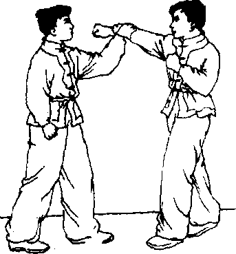 接实战预备式,对方上左步以左拳或左掌击打我面部,我 向右侧闪避,并以左臂向外格挡;随即,我左臂从对方左臂上 290