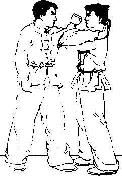 双方实战预备式站立,对方上右步以右拳击打我胸腹部,我 迅速撤右步,身体右