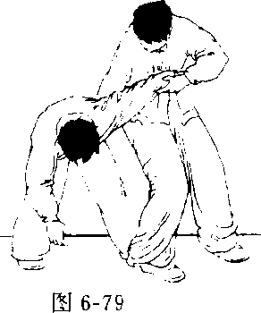 方向下,抱住其左臂。同时,我向前上右步,落在对方左脚前 方,别住对方左腿,然后上体猛向左转体,迫使对方上体前俯, 我右手经对方左腋卜插入,抓其裆部(图6-78、6-79)。