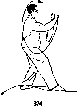 左脚尖微向外撇,身体重心逐渐前移至左腿, 身体起立,右脚向前近出半步,脚尖点地,成右虚 步;同时右手向下、向前划弧,两手变拳在88前相 互交叉成十字拳,石拳在外,拳心向前,至拳拳心 向后;眼平看前方(图374) o
