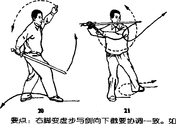 左脚向左后方若步,右脚随即微向后撤,脚尖 点地,成右虚步;同时,右手剑先随身体左转再随 身体右转经体前向石、向下按CW,力注剑刃,剑 尖略下垂,高与膝平;左剑指由左后方绕行至左额 上方(掌心斜向_t);眼平视右前方(图20)。
