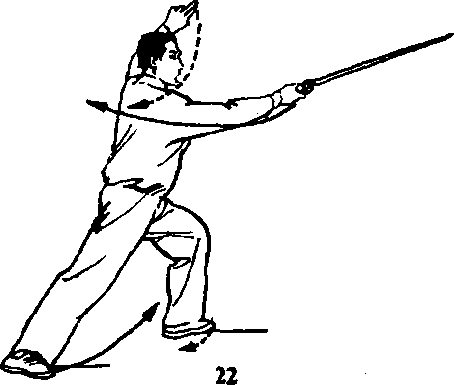 右脚向右后方回撤一步,左脚收至右旎内例后 再向左前方迈出,成左弓步,面向左前方;同时, 右手剑随身体转动经面前向后、向下抽卷,再向左 前方刺出,手心向上,力注剑尖;左手剑指向石、 向下落,经体前再向左、向上绕行至左颔上方,手 心斜向上,普要撑圆;眼看剑尖(图21、22)o