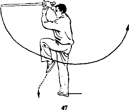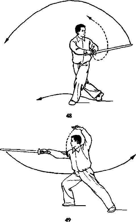 ① 左脚向前横落,身体左转,两睡交叉成半坐 盘式,右脚跟高地,同时右手剑向身体左后方穿挂, 剑尖向后;左剑指仍附右腕上;眼向后看剑尖(图 48)。