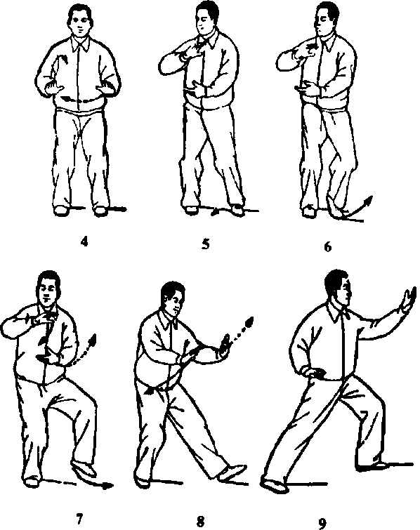 要点:头颈正直,下颁微向后收,不要故意挺胸或 收腹。精神要集中(起势由立正姿势开始,然后左脚 向左分开,成开立步)。