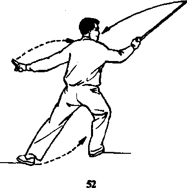 跟外转,左腿蹬直,成右伽弓步;同时,右手剑向 右后上方斜削击出,力在剑刃前端,手心斜向上, 剑尖斜向上,高与头平;左剑指向左下方分开平展, 剑指略低于肩,手心向下;眼看剑尖(图52)。