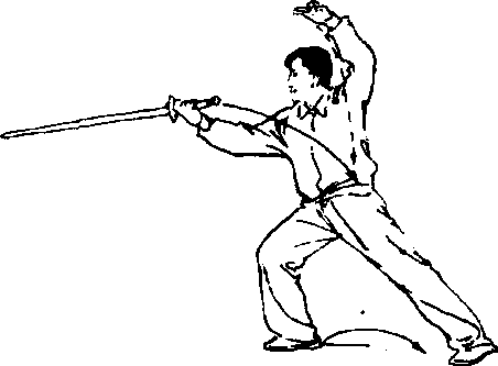 右脚前进一步,成右弓步;同时,右手剑随转体动 作向前方剌出,力贵剑尖,手心向上;左剑指经体 前顺左肋反痛,向后再向左上绕至左额上方,手心 斜向上;眼看剑尖(图54)。