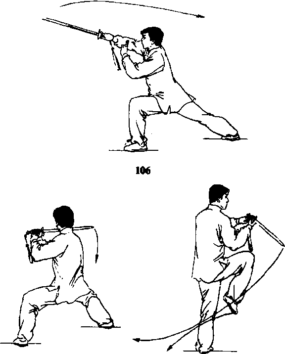 后,剑尖斜朝下;左手剑指仍附于右腕上;目视剑 尖(图108)o