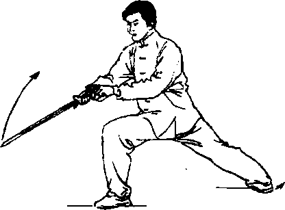 3 .随身体右转(约180°),左脚跟向左辗转,右 脚向右后方落步成右弓步;同时右手握剑向前下方