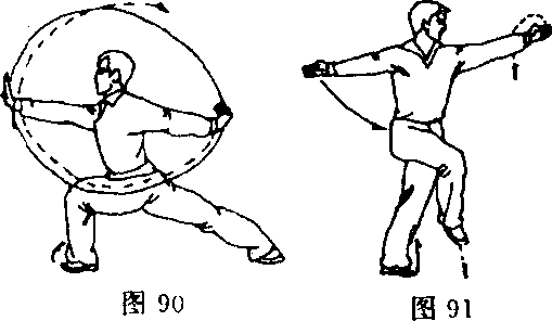 ①身体右后转,右臂向上、向下、向后绕行一周,左勾手变 掌,左臂向下、向上、向前绕行一周;同时,左腿直立,右腿屈 膝在体前提起(图91)。