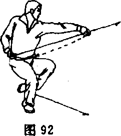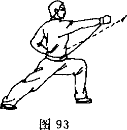 ③左脚向前一步,右腿挺膝蹬直成 左弓步;同时,右拳由腰间向前平直冲 出,拳眼向上,左掌变拳,屈肘收抱于 左腰侧;目视前方(图93)。