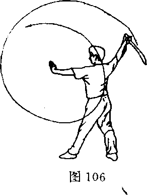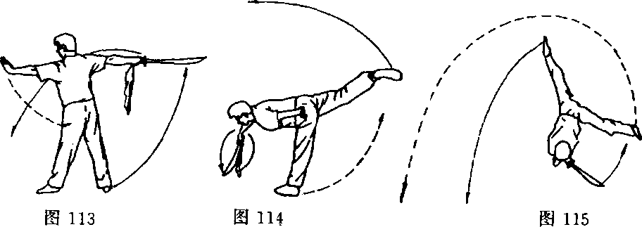 ⑥右腿继续向上摆起,左脚蹬离地面上摆,身体腾空;同 时,右手持刀,以腕为轴平扫刀一圈(图115)。