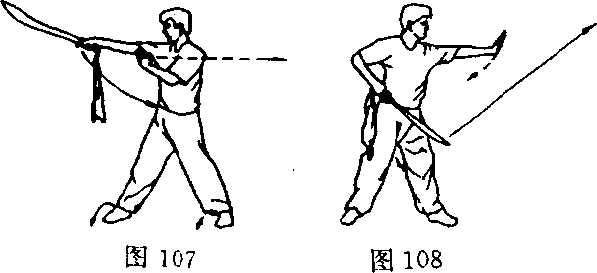 ①紧接上势,以两脚掌为轴,身体左转;同时,右手持刀下 落内旋屈肘收至右腰侧,左掌向左侧推出;目视左掌(图108)。