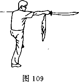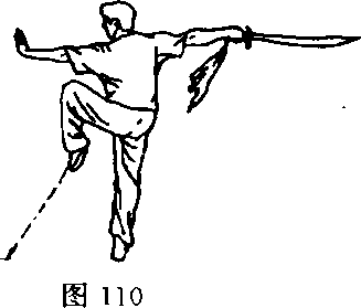 ②身体继续左转,右腿直立支撑,左腿屈膝上提;右手持刀 向右侧伸出扎刀,左掌收至右肩前,成立掌;目视刀尖(图 109)。