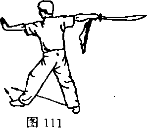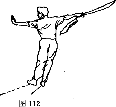⑤上体向下俯,右腿向上摆起;同时,右手持刀外旋左下摆 至头下方时,屈肘屈腕,使刀横于体前,左臂自然摆动(图 114)。