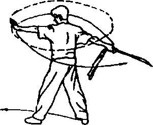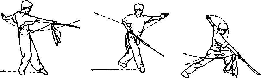 以左脚掌为轴,身体左后转后仰,右脚上一步,屈膝,身体 重心落至右腿,左脚跟提起稍后收;同时,右手持刀随体转向左 平摆抹刀,刀尖斜向右,刀刃朝左;目视刀(图117)。