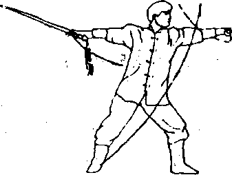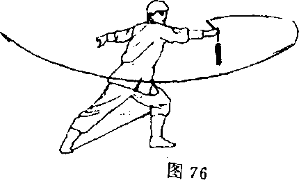 ①两脚不动,上体略左倾;左剑指直臂外展,虎口朝下,右 手持剑臂内旋直臂向左侧前伸,平剑;目视左前方(图76)。