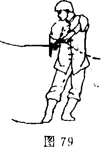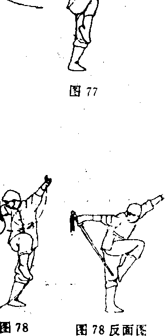 ③两脚不动;左剑指抖腕亮 指于头左前上,右手持剑向右横 出做斩剑后,紧接扣腕使剑尖向 下做挂剑,剑尖高不过膝;目视一_ 右侧(图78及反面图)。 (