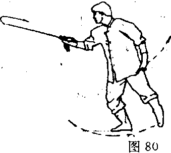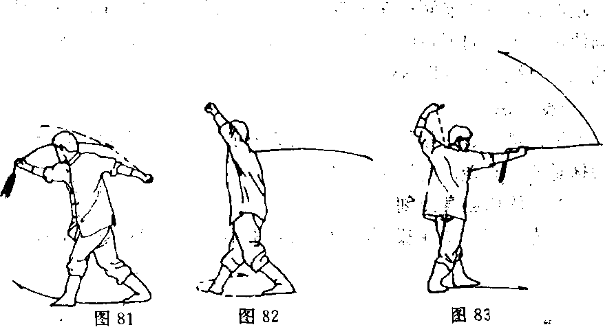 ③重心向右前移,左脚沿弧线内扣于右脚前,右脚不动;左 剑指直臂向后上展,手心朝下,右手持剑还继续绕圆弧向右前平 穿,剑尖高不过口,低不过喉;目视剑尖处(图81)。
