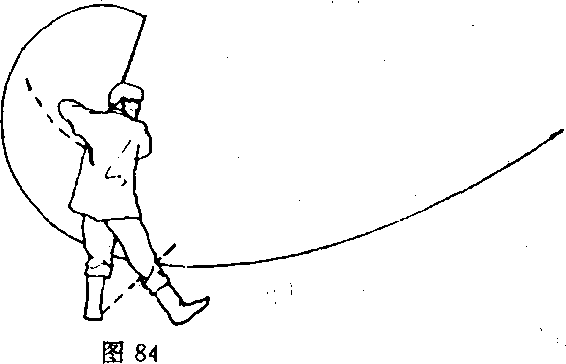 ①左脚不动,有脚向右前上步,脚跟先着地;左剑指由头上 下按于右胸前,手心朝下,右手持剑臂外旋,屈臂向上弧线回收 至左胸前,手心朝内;目视上动剑尖所指方向'(图84)」“