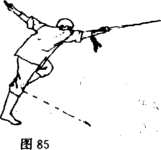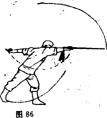 ①左脚下落微屈膝,右脚不动;两手不动;目视剑尖(图86)。