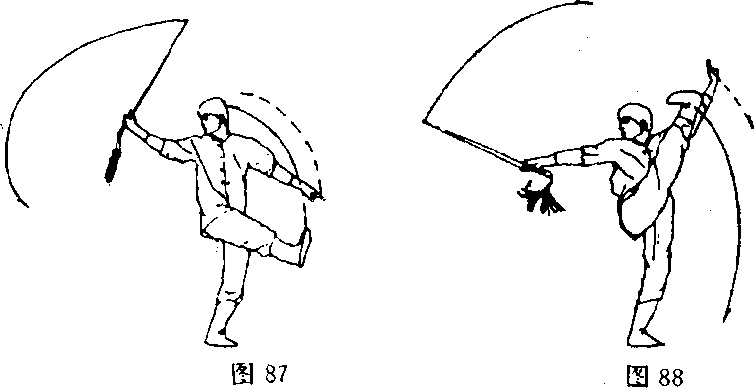 ②左脚不动,左膝蹬直;右脚离地勾脚尖向前方正踢腿,上 体立直;左剑指臂略外旋下落沿弧线向前由上架指,手心斜朝 上,右手持剑略屈臂上举后落,剑尖由前向上、向后沿弧线点 剑,点剑时直臂,上体右后转;目视剑尖方向(图87、88)。