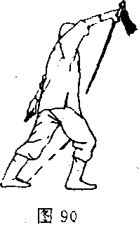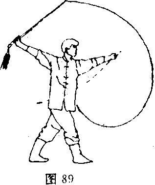 ①右脚下落;左剑指下落前 指,虎口朝上,右手持剑扣腕使 剑尖指向前上方;目视左手剑指 方向(图89)。