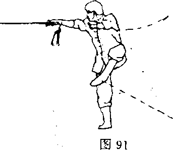 体左转后成提膝独立;左剑指下落后,臂外旋屈肘回收于右肩 前,虎口朝内,右手持剑经胸腹前穿剑,向后转体回身刺剑;目 视剑尖(图90、91)。
