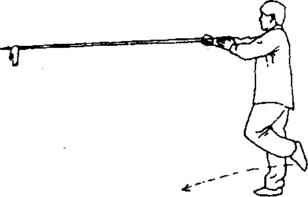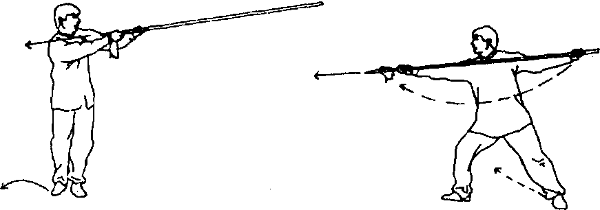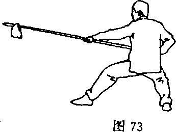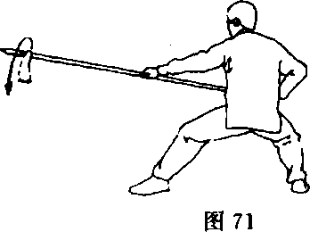 ②右脚向右上步;同时,左手松握枪身,右手抓握枪颈,屈 肘刺向咽喉;随身体右转,头略向后仰,枪尖贴颈擦过,右手引 枪向右前方扎出;目视枪尖(图82)。