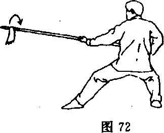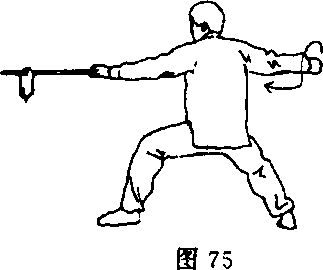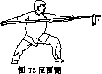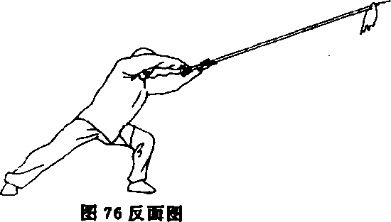 ①上体略向右转,重心后移成半马步;左手松握枪身;同时,右 手抽把至腰右外侧,再回送至左前臂处,前臂内旋,右手虎口朝把 端反握枪把;目视枪尖(图75及反面图、图76及反面图)。