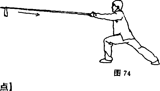 ③身体右转;右手张开,左手用力推送枪身,使枪由右掌中 向前方平穿出;随即左掌先向左后方撑展,然后向下摆至右手腕 处;左腿屈膝抬起;目视枪尖(图83、84)o