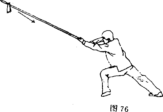 ③重心前移成左弓步;右手推把向前扎枪,枪与臂平行;目