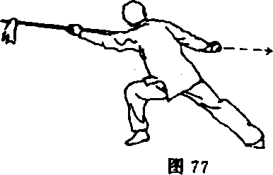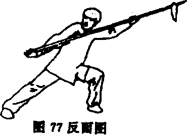 ②重心不变,右手回抽至右腰侧,同时右手松握枪把,左手 用力向后推送枪身,使枪把在右手中向右后上方穿出,当右手触 及枪缨时握住枪颈,抡至左肘后;目视枪把(图77及反面图、 78及反面图)。