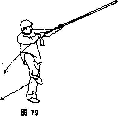 ③左脚蹬地,右腿屈膝提起,身体随之右转,左腿站直;同 时,右手反握枪,右前臂外旋使枪尖转向右方,左手伸向右手前 接握枪身;目视左手(图79)。