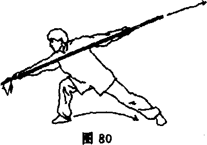 ④身体右后转,右脚向后落步成右弓步;随转身右手抽枪虎 □对着枪把向右下扎出,与膝同高;目视枪尖(图80)。