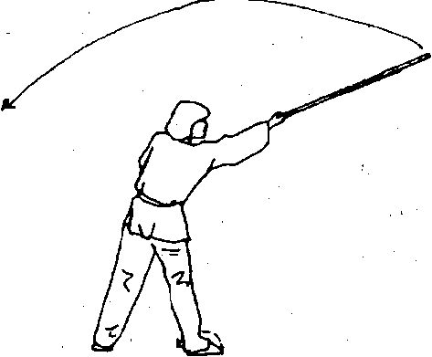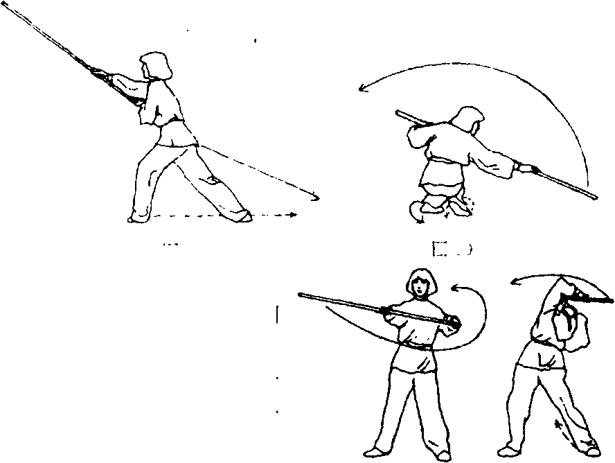 ①左脚掌外转,身体立 起左转180度,右脚向前迈 一步,重心移向右脚成开立 步;同时,两手握棍将棍把 由下向身体右斜上方击把, 击把时两手要滑把,右直臂